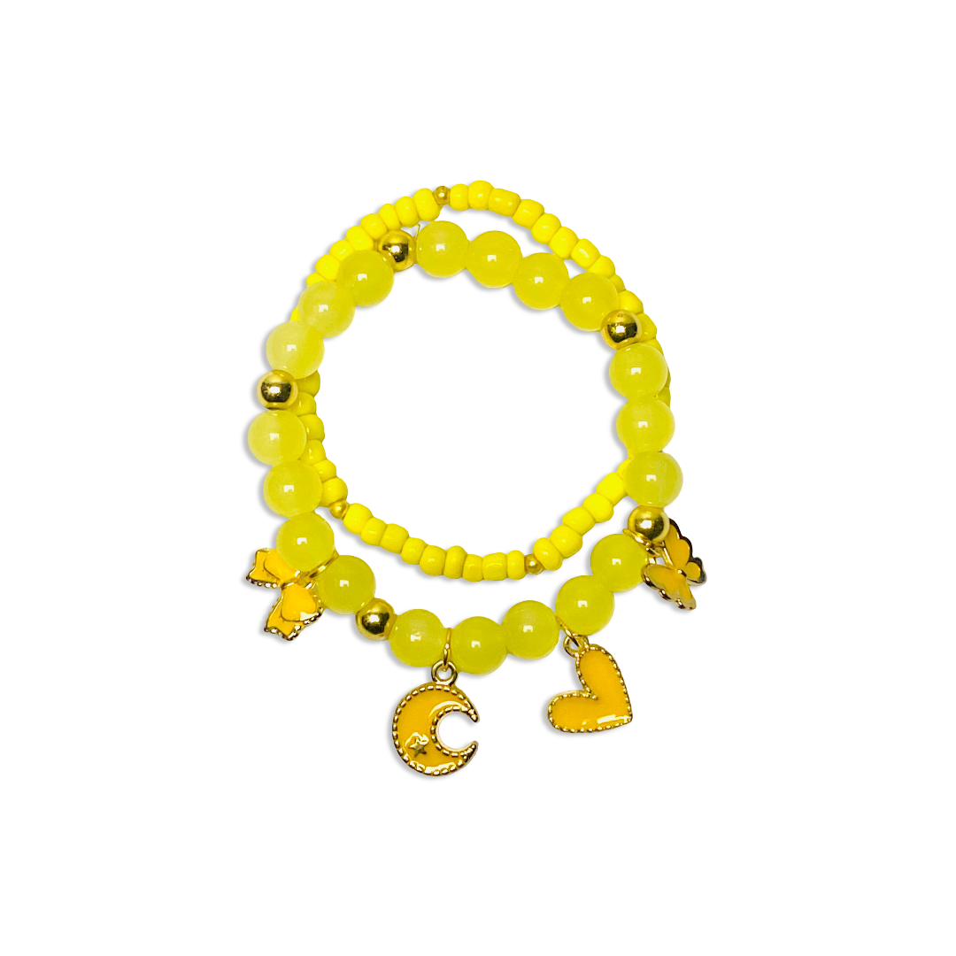 Add a pop of style to your look with our Charmy Bracelets Stack, available in White, Pink, Purple, Black, Red, and Yellow. Featuring playful heart and bunny charms with premium beads, these versatile bracelets are perfect for birthdays, university days, office wear, beach outings, and casual summer fashion.