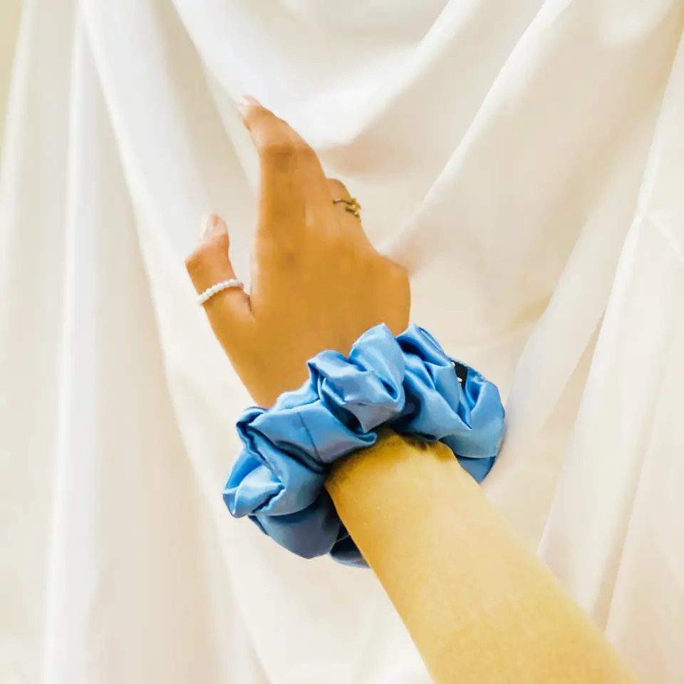 A soft and calming powder blue scrunchie in Pakistan designed for strong hold, hair protection, and effortless everyday styling.