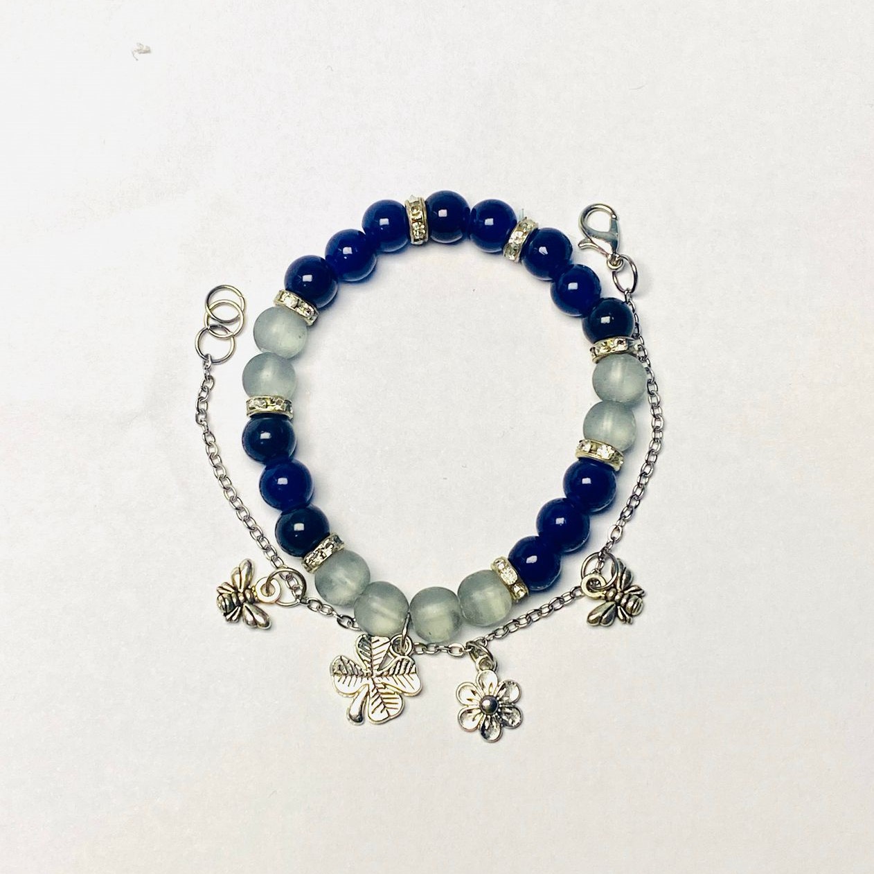 MIRA Bracelet – A signature beaded bracelet in navy & frosted grey with silver charms (clover, bees & flowers). Stylish, versatile, and perfect for gifting or daily wear.